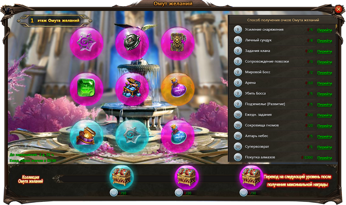 В функционале события представлены этажи с несколькими ступенями, Коллекция Омута желаний, а также специальные задания. Выполнив то или иное действие необходимое количество раз, вы получите соответствующее количество Очков Омута желаний. Используя их вы можете выбрать одну из 3-х наград соответствующей ступени – сделать это можно непосредственно на ступени или при открытии сундука коллекции (функции равнозначны). Переход на следующий уровень происходит после получения максимальной награды текущего этажа. Всего в Омуте желаний можно покорить 3 этажа.