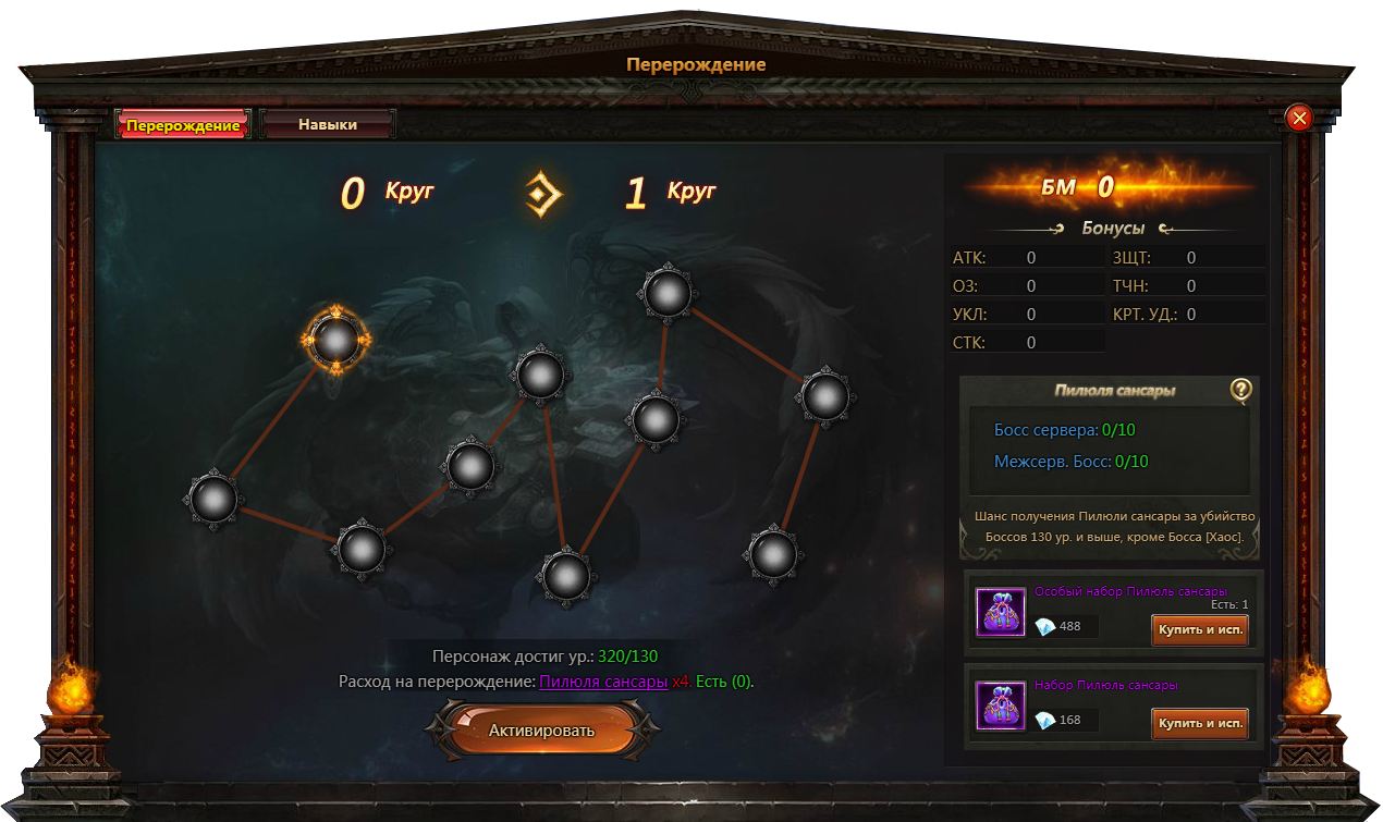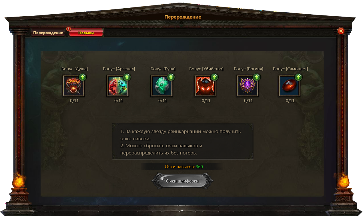 За каждую звезду перерождения можно получить очко навыков, позволяющих развивать специальные Бонусы и активировать их эффекты:
