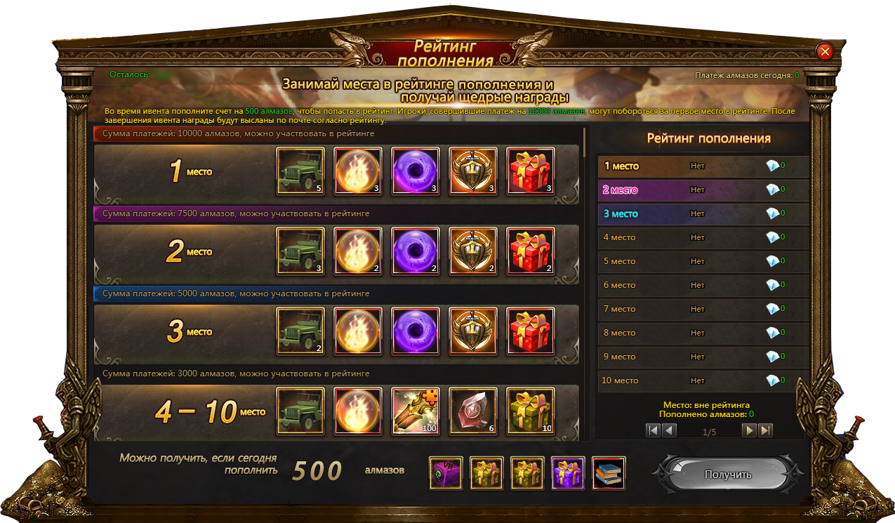 Не упустите шанс принять участие в событии «Рейтинг пополнения», занять в нем почетное место и выиграть множество ценных призов за позицию, достигнутую на момент завершения ивента! Обратите внимание, что событие является межсерверным. Рейтинг формируется в зависимости от суммы пополнений участников. По окончании ивента награды за рейтинг будут отправлены на внутриигровую почту.