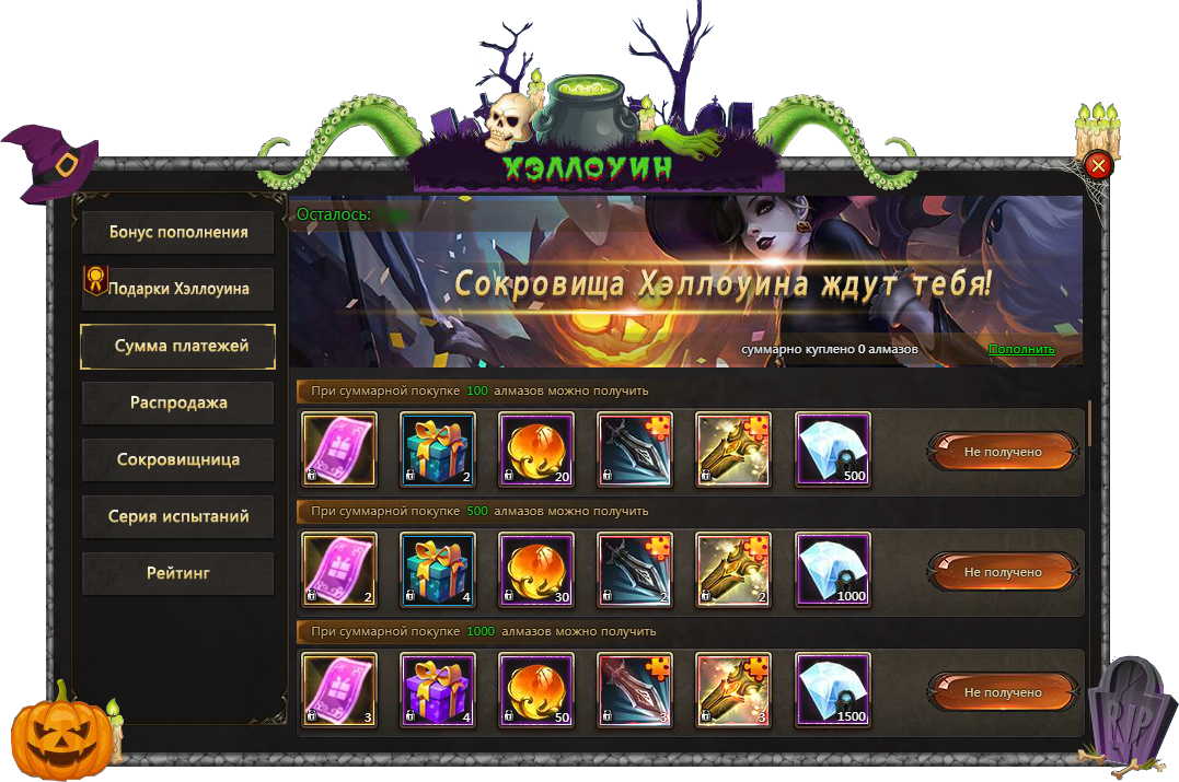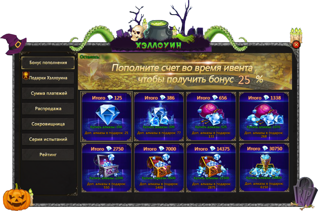 При общей покупке алмазов на определенную сумму вы получите дополнительную выгоду в виде множества ценных призов. Сокровища Хэллоуина ждут вас!