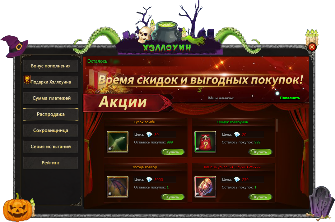 Время скидок и выгодных покупок! В рамках акции «Распродажа» у вас есть отличная возможность приобрести ряд предметов по специальной цене — Сундуки Хэллоуина, Крылья Хэллор, Куски зомби и другие товары.