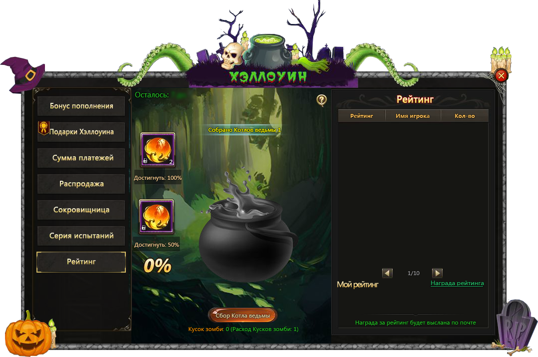Кроме того применение Кусков зомби для заполнения Котлов дает шанс занять почетное место в специальном рейтинге. Используйте как можно больше этих предметов — 10 игроков сервера с наибольшим числом задействованных Кусков зомби получат особые награды.
