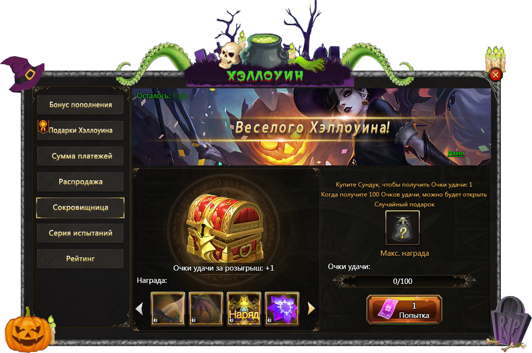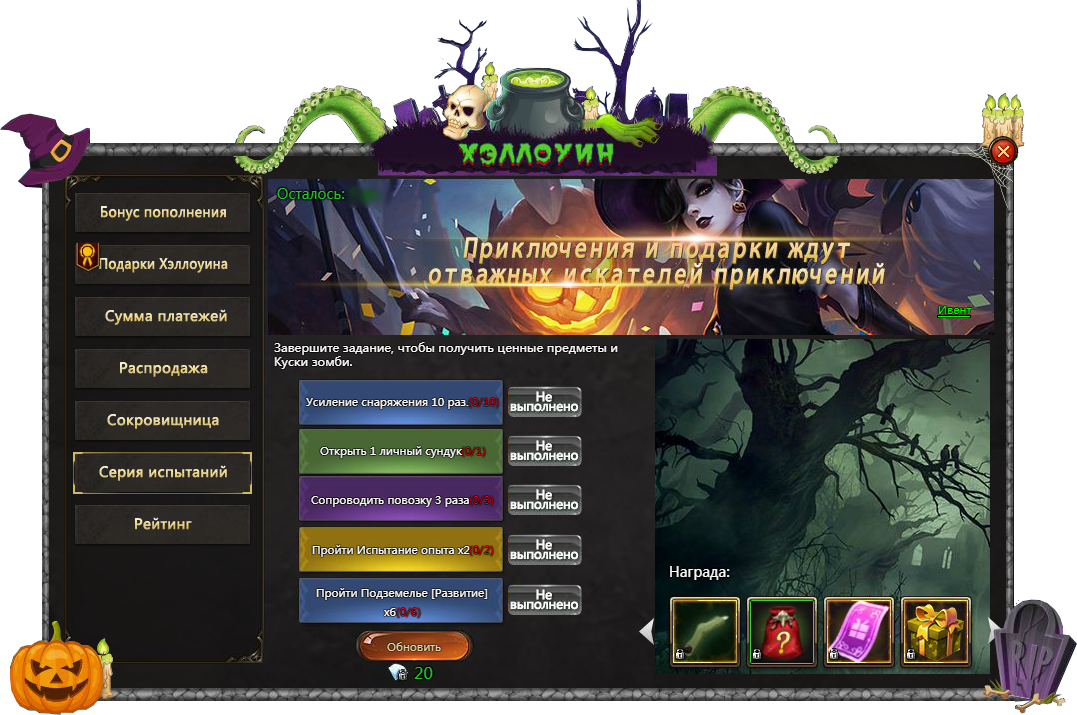 Испытания, битвы и путешествия – Хеллоуин полон приключений! Участвуйте в ивенте «Серия испытаний», выполняйте миссии и получайте призы.
