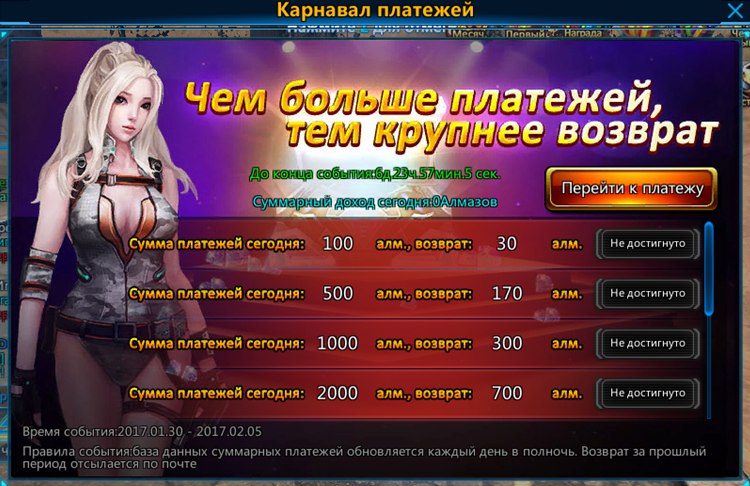 Posted 26 Jan 2017 Дорогие игроки! Представляем вашему вниманию анонс событий на период с 27 января по 2 февраля. 27-29 января продолжается ивент "Отчет", в котором вы получаете награды просто ежедневно заходя в игру и отмечаясь в окне ивента! Не пропускайте ни дня, чтобы получить награду побольше! С 27 по 29 января всех игроков также будут ожидать выходные скидок! На этот раз нас ждут отличные модели вооружения и детали оружия, а также стильные костюмы! С 30 января по 5 февраля за пополнение счета вас ждут бонусные алмазы до 70% от суммы платежа! Это - Карнавал платежей в Dark Times! Таких бонусов еще не было! Чем больше сумма платежа, тем больше алмазов вы получите в награду!\ Обсудить данную новость вы можете здесь или в группе в ВК. С уважением, Администрация Dark Times Share this post Link to post Share on other sites