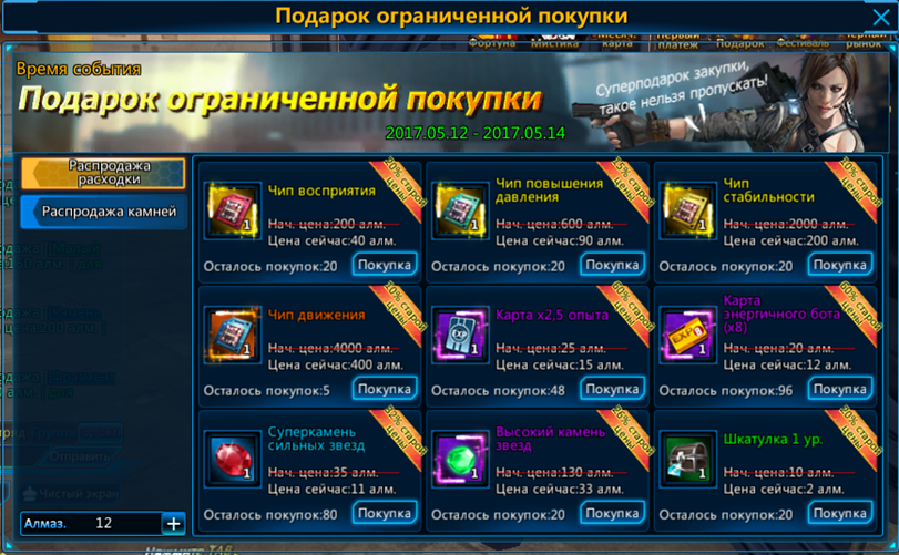 Posted 8 May 2017 Майские праздники продолжаются - и мы продолжаем радовать игроков интересными игровыми и внеигровыми событиями! Узнайте больше из этой новости! Продолжается ивент "Постоянная рассылка подарков за доклады" - до 14 мая ежедневно отмечайтесь в "Отчете" - и получайте щедрые награды! Еще 2 дня, до 9 мая включительно, можно получить бонусы в ивенте "Мобилизация". До 9 мая также активна акция на покупку самых популярных игровых предметов с большой скидкой: праздничная распродажа ждет своих покупателей. 8 мая стартовал ивент "Расколотые яйца". Он будет длиться всю неделю до 14 мая включительно. Ежедневно у каждого игрока есть 2 бесплатные попытки и неограниченное число попыток по 10 алмазов за раз, чтобы получить игровые ценности, в том числе редкие чипы транспорта и самоцветы 4 уровня! С 12 по 14 мая проходит Операция "Алое перо" - специальная акция, которая позволит получить максимальную пользу от пополнения счета. А потратить полученные алмазы вы сможете на распродаже выходного дня, которая открыта все выходные в меню "Фестиваль": В официальной группе в ВК проходит интересный конкурс на поиск врагов в локациях Dark Times. Ознакомиться с условиями можно здесь. Продолжается прием заявок на конкурсы на форуме. Подробности вы можете прочитать в отдельной новости. Обсудить данную новость вы можете здесь или в группе в ВК. ID официальной группы в RaidCall - 80123. С уважением, Администрация DT Share this post Link to post Share on other sites