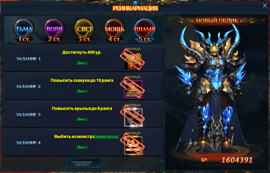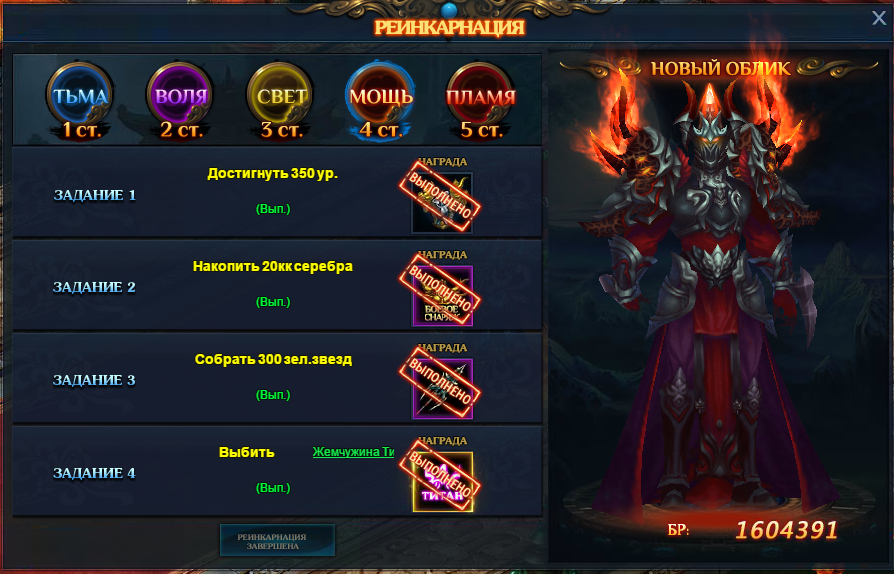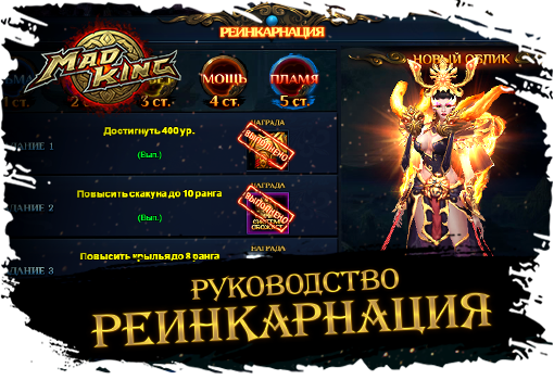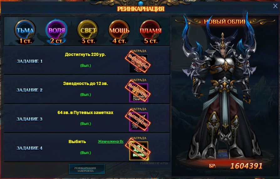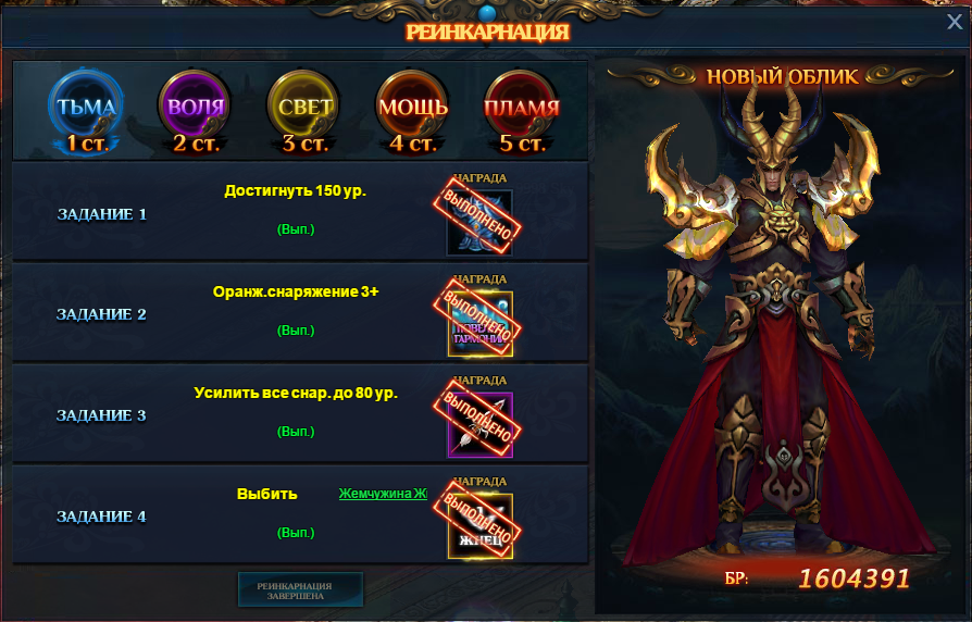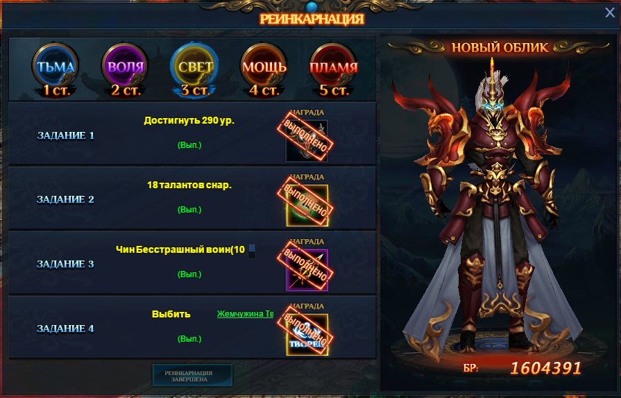 Posted 19 May 2017 Реинкарнация - неотъемлемая часть игры, от которой напрямую зависит развитие вашего персонажа. Кроме полезных предметов и новых костюмов, она открывает новый игровой контент, а также даёт доступ к выплавке и использованию Платинового и Боевого снаряжения. А ещё за каждую пройденную ступень вы получите особые титулы, которые всегда будут отображаться рядом с именем вашего персонажа, демонстрируя окружающим, каких высот вы достигли. Реинкарнация открывается на 120 уровне. С этого момента вы сможете выполнять специальные задания, за которые можно получить различные награды. Все задания, кроме достижения уровней, можно выполнить также и за золото. Всего в игре доступно 5 ступеней Реинкарнации и 5 особых титулов, соответствующих каждой ступени. Ступень Название Титул 1 Тьма Жнец 2 Воля Воин 3 Свет Творец 4 Мощь Титан 5 Пламя Феникс Реинкарнация первой ступени Задание 1: Необходимо достичь своим персонажем 150 уровня. Награда: Наряд 1 ступени (можно использовать в функционале Обликов). Задание 2: На персонаже должен быть одет как минимум один предмет оранжевого снаряжения 3 ранга или выше.Награда: Титул «Повелитель Гармонии» (доступен для использования в обзоре персонажа, в разделе титулов). Задание 3: С помощью функционала «Ковка» необходимо усилить* все предметы, одетые на персонажа, получив комплект 80 уровня.*Примечание: Кнопка «Усилить» позволяет улучшать один отдельно выбранный предмет снаряжения. С помощью «Быстрого усиления» можно улучшать все 10 предметов снаряжения единовременно.Награда: Фиолетовое оружие 5 ранга. Задание 4: Собрать и пожертвовать 10 Жемчужин Жнеца, которые можно получить в качестве трофеев в открытом мире или в Башне Нечисти.Награда: Особый титул «Жнец». Реинкарнация второй ступени Задание 1: Необходимо достичь своим персонажем 220 уровня.Награда: Наряд 2 ступени (можно использовать в функционале Обликов). Задание 2: С помощью функционала «Ковка» повысить Звездность всего снаряжения до 12 уровня. Для этого вам потребуется примерно 500 Зеленых звезд или 50кк серебра.Награда: Возможность выплавлять и использовать Платиновое снаряжение. Задание 3: Пройти несколько локаций в Путевых Заметках, набрав в сумме 64 звезды. Звёздный прогресс отображается на нижней панели данного функционала, который называется «Скрытый уровень». Чем меньше времени вы будете тратить на прохождение каждого этапа, тем больше звёзд сможете получить (максимум 3 звезды за 1 этап, 18 звёзд за 1 локацию).Награда: Фиолетовое оружие 6 ранга. Задание 4: Собрать и пожертвовать 20 Жемчужин Воина. Их нельзя получить в качестве трофеев в открытом мире и в Башне Нечисти, поэтому необходимо воспользоваться функционалом Синтеза. В разделе «Реинкарнация и Капсулы» выберите необходимый лот и обменяйте Жемчужины Жнеца на Жемчужины Воина в соотношении 3:1.Награда: Особый титул «Воин». Реинкарнация третьей ступени Задание 1: Необходимо достичь своим персонажем 290 уровня. Награда: Наряд 3 ступени (можно использовать в функционале Обликов). Задание 2: Сумма Талантов всего снаряжения, одетого на персонажа, должна быть не менее 18. Таланты снаряжения - это особые характеристики, которые можно найти в тултипах снаряжения (при наведении на иконки).Награда: Свиток выплавки х5. При наведении на специальный символ в обзоре персонажа можно узнать, какой комплект талантов с