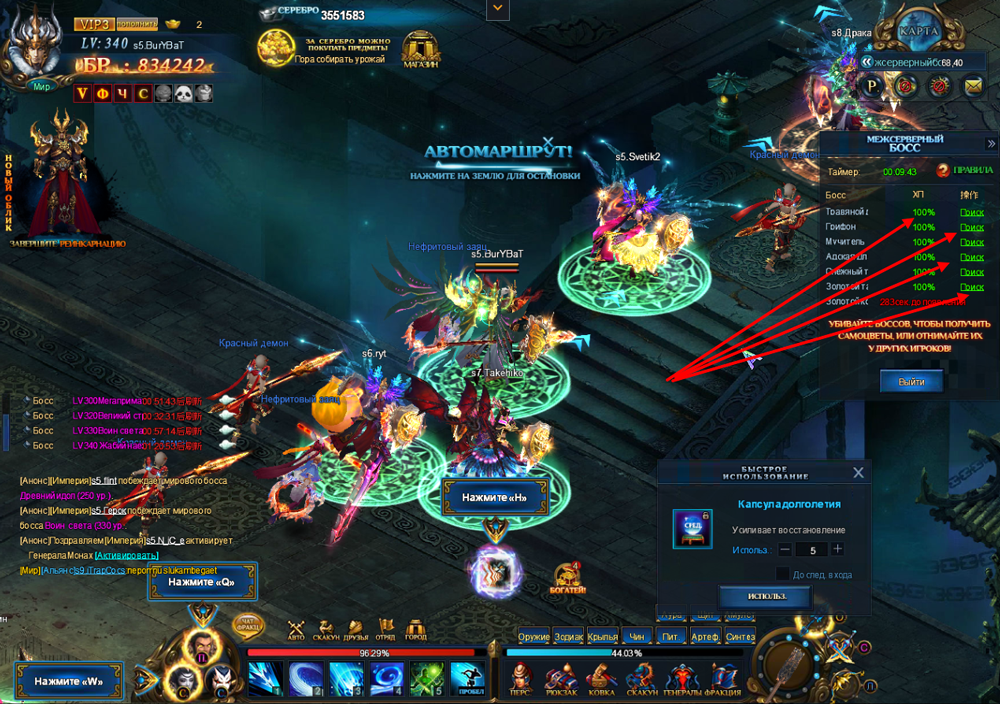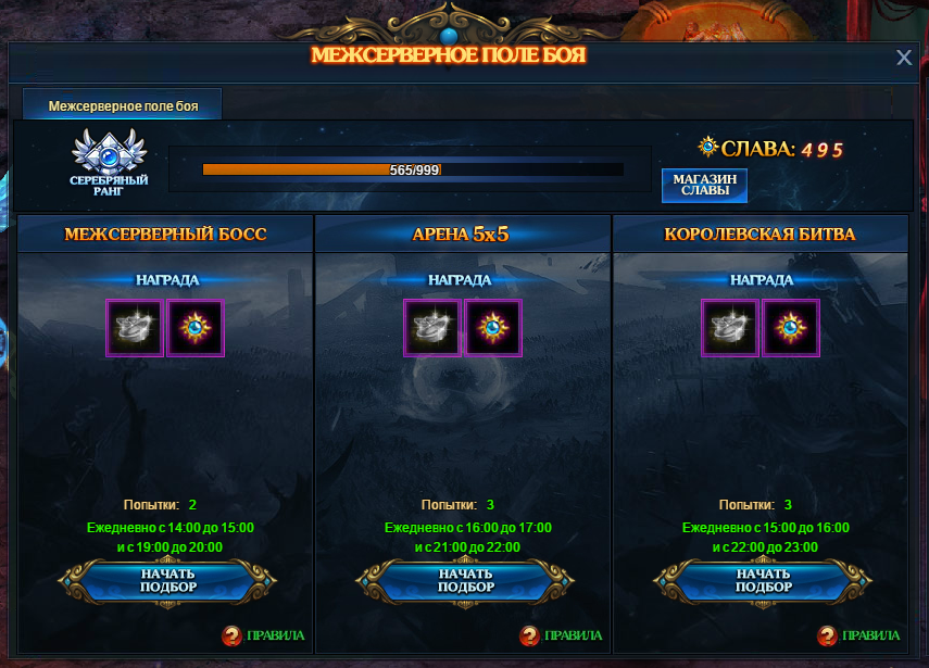 Posted 16 Jun 2017 Нет меры беспредельности небесной, О, как земля огромна и чудесна! Законы неба держат в подчиненье Всего живого в мире зарожденье... Межсерверное поле боя объединяет три независимые арены, где игроки могут сражаться друг с другом. Это одна из основных PvP-активностей в игре. Чтобы перейти в меню битв, нажмите на соответствующую иконку: Вы всегда будете знать, сколько попыток участия в межсерверных битвах у вас осталось на текущий день, благодаря отображению цифры в левом верхнем углу иконки. На данный момент существует три межсерверные арены: Межсерверный Босс (2 попытки в день). Арена 5х5 (3 попытки в день). Королевская Битва (3 попытки в день). Каждая арена открывается в строго отведённое для неё время, указанное по московскому часовому поясу. Чтобы попасть на любую из трёх арен, необходимо нажать на кнопку «Начать подбор» напротив неё. Подбор арены осуществляется между игроками с одинаковым рангом, а при нехватке нужного количества человек на арену смогут попадать игроки ближайших рангов. После того, как соберётся необходимое количество игроков, на экране появится уведомление о входе на арену. Будьте внимательны: если вы не успеете нажать на кнопку входа, сообщение исчезнет через некоторое время и вы не сможете зайти на данную арену, попытка будет списана без начисления очков. Во время сражений вы зарабатываете специальные Очки Славы, которые необходимы для поднятия вашего межсерверного ранга. Всего их четыре: Бронзовый ранг Серебряный ранг Золотой ранг Почётный ранг В окне межсерверных сражений отображается ТОП-10 игроков с самым высоким рангом сервера, а также количество Очков Славы, которые имеются у данных игроков на текущий момент. Далее рассмотрим более подробно каждое из межсерверных событий. Межсерверный Босс Данная арена открывается ежедневно в следующие временные периоды (указано московское время): с 14:00 до 15:00 с 19:00 до 20:00 Здесь вам предстоит сражаться с боссами и другими игроками, чтобы заработать зелёные и красные самоцветы. Чем больше камней вы получите, тем выше будет финальный счёт и, соответственно, больше заработанных Очков Славы. Бой длится 10 минут. Если по окончанию таймера игрок не получит ни одного самоцвета, он теряет очки, что может привести к снижению межсерверного ранга. Чтобы проложить путь к любому из боссов, достаточно нажать на кнопку «Поиск». Персонаж автоматически отправится сражаться с выбранным боссом. Когда у босса остаётся 70% ХП, игроки могут получить трофейные самоцветы красного цвета. Игрок, нанёсший последний удар по боссу, считается его убийцей и получает дополнительную награду: Чтобы атаковать других игроков, используйте Режим PK. Во время сражений вы можете отбирать заработанные другими игроками самоцветы. Но будьте осторожны: точно также и другие игроки могут напасть и отобрать ваши самоцветы. Арена 5х5 Данная арена открывается ежедневно в следующие временные периоды (указано московское время): с 16:00 до 17:00 с 21:00 до 22:00 Арена предназначена для групповых сражений 5х5. Основная цель - выжить, защищая своих сопартийцев, и убить группу противников. В начале боя у вас есть дополнительные 100 секунд для осмотра команды противников и выстраивания стратегии. Если игрок не успеет зайти на арену или покинет её в течение этого времени, то попытка будет списана без начисления очков. Повторно з