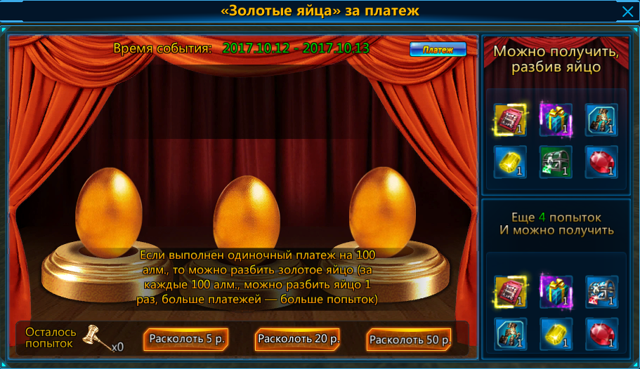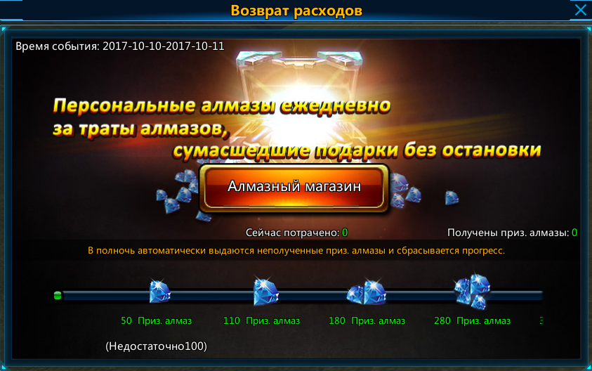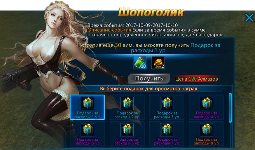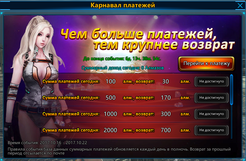 Posted 30 Oct 2017 Бойцы! Каждый из вас должен быть в курсе событий, ожидающих нас в игре с 30 октября по 5 ноября! "Мобилизация" 30 октября - 5 ноября Пополняйте счет в игре и получайте за это дополнительные награды: камни звезд, золото, камни вставки, купоны киборга и другие игровые ценности! "Карнавал платежей" 30 октября - 5 ноября Бонус возрастает с суммой пополнения! Чем больше сумма пополнения, тем крупнее возврат вы можете получить. Он может достигнуть и 100%! "Шопоголик" 30-31 октября Награды выдаются за покупку от 30 алмазов. Больше тратите, больше получаете - поэтому ни в чем себе не отказывайте! "Возврат расходов" 31 октября - 1 ноября За трату алмазов вы будете получать бонусный возврат в виде призовых алмазов. "Рейтинг расходов" 1-3 ноября Первая вкладка предлагает получить награды в рейтинге за траты от 1000 алмазов, а вторая - за все три дня, но попадание в рейтинг возможно при расходах от 3000 алмазов. "Золотые яйца" 2-3 ноября За пополнение счета от 100 алмазов вы сможете получить дополнительную награду. "Колесо фортуны" 2-8 ноября За золото, призовые алмазы и алмазы пополнения вы можете получить награды, представленные в различных слотах этого игрового функционала. "Скидки" 3-6 ноября Вас ждет оружие, суперэкстракты, чипы, а также отвага, опыт, честь и многое другое с значительными скидками. Не забывайте заглядывать на форум, чтобы узнать о конкурсах, которые проходят прямо сейчас! Обсудить эту новость вы можете здесь и в нашей группе в ВК. ID официальной группы в RaidCall - 80123. С уважением, Администрация Dark Times Share this post Link to post Share on other sites