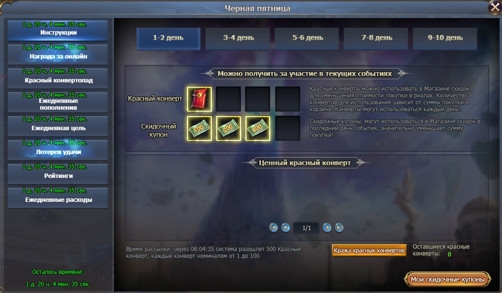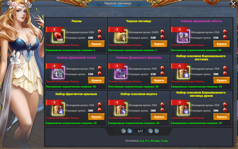 Posted 25 Nov 2021 Уважаемые игроки! 26 ноября, с 5:00 (МСК) все серверы игры будут закрыты для проведения технических работ. Ориентировочная длительность ~ 2 часа. При возможности игра будет доступна раньше. Во время технических работ на серверах пройдет подготовка к запуску внутриигровых событий, о которых мы расскажем вам прямо сейчас! Черная пятница 26 ноября в игре стартует увлекательное событие "Черная пятница" длительностью 10 дней. Ценные награды и большие скидки ждут! В ходе ивента можно будет получить множество полезных и ценных призов, в том числе фрагменты маунта, моды для персонажа, крыльев эльфа, карты таланта и другие полезные предметы. Распродажа Черная пятница 26 ноября, сразу после технических работ в игре стартует распродажа в честь Черной пятницы! Событие продлится только три дня - вас ждут огромные скидки и уникальные предметы! Обратите внимание на новый классный костюм, который можно будет выкупить во время распродажи: Циклические события 26 ноября откроется событие Таинственные сокровища, длительность которого составит 3 дня 29 ноября откроются события Холдем турнир и Кража сундука, длительность которых составит 4 дня 4 декабря откроется событие Бонусные риалы, длительность которого составит 4 дня 7 декабря откроется событие Общая лотерея, длительность которого составит 3 дня События выходного дня 27 ноября откроется событие Печать демона, длительность которого составит 2 дня 4 декабря откроется событие Испытание храбрых, длительность которого составит 2 дня Желаем вам новых побед и ярких достижений! С уважением, Команда Dragon Knight 2 1 person likes this Share this post Link to post Share on other sites