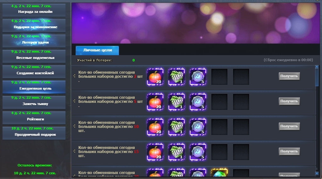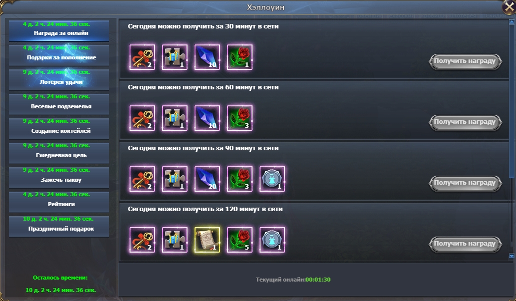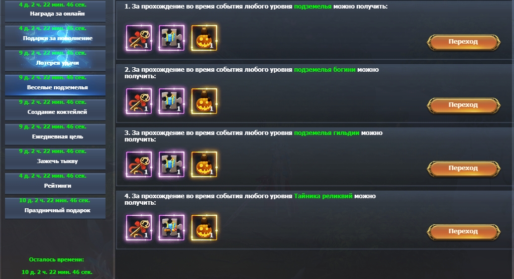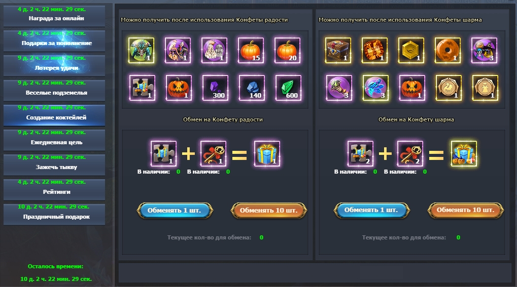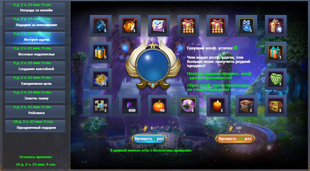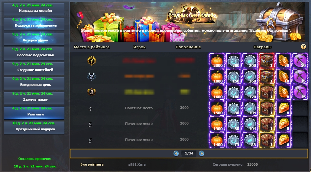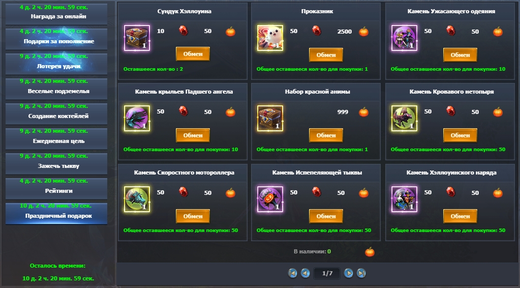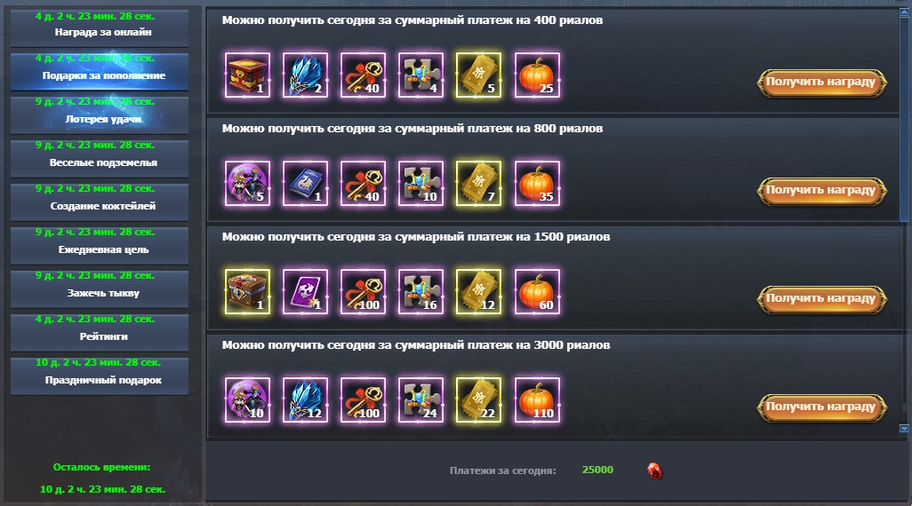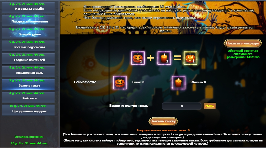 Posted 18 hours ago Хэллоуин - 2025 С 24 октября будет доступно увлекательное событие «Хэллоуин». Продлится данное событие 11 дней, а принять участие в нем могут игроки, достигшие 30 уровня. На протяжении всего ивента будут доступны вкладки, описанные ниже. Награда за онлайн За время, проведенное в игре, вы будете получать приятные подарки. Подарки за пополнение Пополняя игровой счет на определенные суммы риалов, вы гарантированно получите подарки. Лотерея удачи Испытать свою удачу и получить замечательные призы можно в данной вкладке. Чем выше коэффициент удачи, чем больший шанс получить редкий предмет. При получении редкого предмета коэффициент удачи сбрасывается. Для одного вращения необходимо 20 риалов (можно использовать любые риалы) на покупку одного Купона лотереи удачи, на 10 вращений - 200 риалов. Веселые подземелья Прохождение подземелий даст Вам дополнительные награды. Обменять набор Поменять наборы и получить еще больше наград можно в данной вкладке Для получения малого набора необходимы: Осколок малого набора - 1 шт и Ключ от набора - 1 шт. Открыв Малый набор Хэллоуина, можно получить случайную награду: - Хэллоуин очки - 10 шт; - Хэллоуин очки - 20 шт; - Осколок большого набора - 1 шт; - Фрагменты моды - 1 шт; - Тыква - 1 шт (используется для синтеза Зажженных тыкв). Для получения большого набора необходимы: Осколок большого набора - 2 шт и Ключ от набора - 2 шт. Открыв Большой набор Хэллоуина, можно получить случайную награду: - Набор с красной анимой - 1 шт; - Ларец самоцветов 10 уровня - 1 шт; - Ларец рун 9 уровня - 1 шт; - Ларец янтаря 9 уровня - 1 шт; - Фрагменты нового костюма - 1 шт; - Камень чар маунта - 1 шт; - Камень чар костюма- 1 шт; - Тыква - 1 шт (используется для синтеза Зажженных тыкв); - Фитиль - 1 шт(используется для синтеза Зажженных тыкв). Ежедневная цель Принимая участие в Лотерее удачи, можно получить дополнительную награду за определенное количество попыток. Зажечь тыкву Напугайте знакомых своей оригинальной тыквой и получите награду за зажженную тыкву. Для зажигания одной тыквы необходимы: Тыква - 1 шт и Фитиль - 1 шт. Для проведения розыгрыша необходимо 11 участников. Если необходимое количество участников не набрано, то розыгрыш не проводится, а количество зажженных тыкв обнуляется. Чем больше зажженных тыкв, тем выше вероятность выигрыша. Ежедневно в 12, 18 и 21 час среди игроков, имеющих зажженные тыквы, будут разыгрываться призы. После того, как система выберет призера, произойдет сброс всех зажженных тыкв. Во время розыгрыша можно получить очки ивента, осколки моды, монеты желания и книги навыка Рейтинг При пополнении счета во время данного ивента, можно попасть в рейтинг и получить чудесные подарки (рейтинг сбрасывается ежедневно) Праздничный подарок Внимание! При приобретении предметов за кристаллы будьте внимательнее. При недостаточном количестве кристаллов будут использованы риалы. Общее оставшееся кол-во покупок – это количество покупок доступных в течении всего ивента. Оставшееся количество – это количество доступных покупок в течении текущего дня. Сундук Хэллоуина - 1 шт, цена - 50 Хэллоуин очков и 10 риалов (Оставшееся количество: 1 шт). Проказник (титул) - 1 шт, цена - 2500 Хэллоуин очков и 50 риалов (Общее оставшееся количество для покупки: 1 шт). Камень Ужасающего одеяния - 1 шт, цена - 50 Хэллоуин очков и 50 риалов (Общее оставшееся количество для покупки