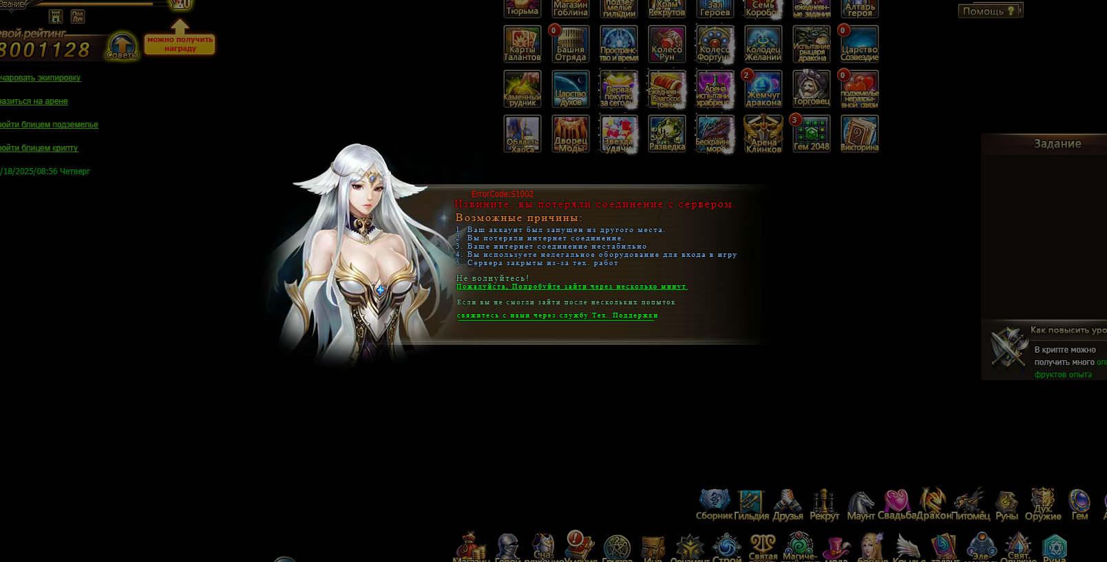 Доброе утро! (Могло бы быть, если бы не проблемы со входом.) После обновления невозможно войти в игру одним из персонажей. На том же аккаунте второй персонаж входит без проблем. Пробовал через клиент, старый браузер с флешем, проблема конкретно на персонаже. Herurg03, сервер 243 Колыбель Зла, ID 1043677053845.