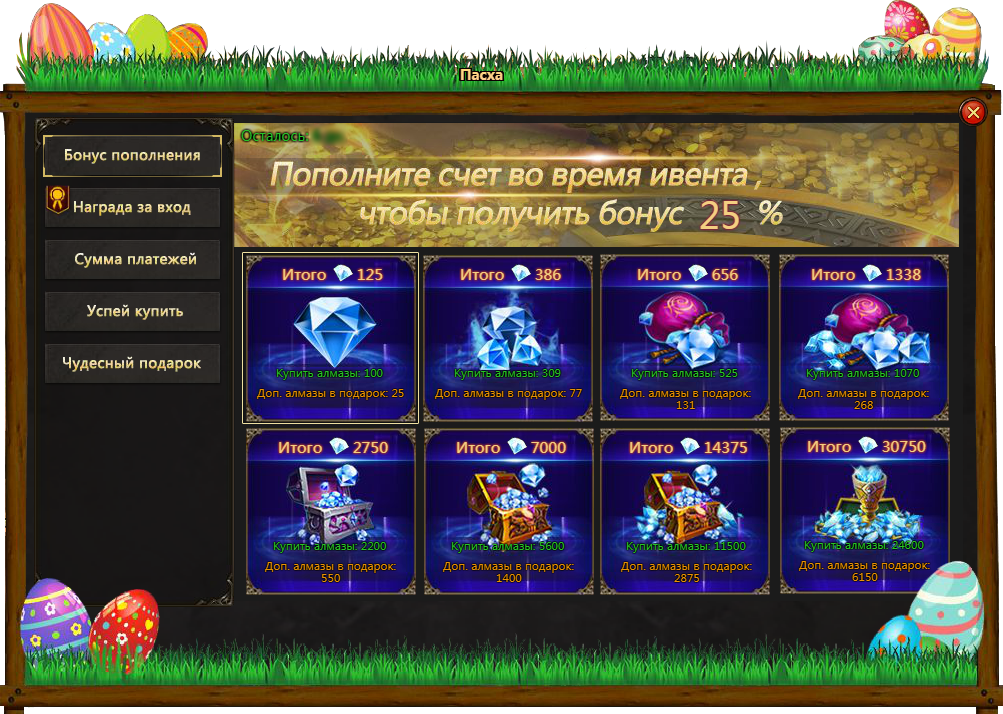 В период действия специального предложения вы можете приобрести алмазы и получить дополнительный 25%-й бонус к выбранной сумме!