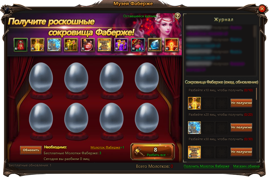 В каждом туре доступно 8 яиц. Когда все яйца разбиты, набор можно обновить бесплатно. Если в туре было разбито лишь несколько яиц, после бесплатного обновления следующая попытка будет доступна через 60 минут или за 20 алмазов.