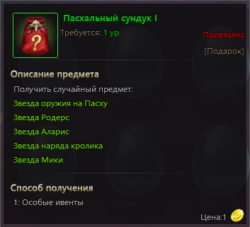 Пасхальный сундук II скрывает внутри множество драгоценных сокровищ! Открыв его, можно получить один из следующих призов: